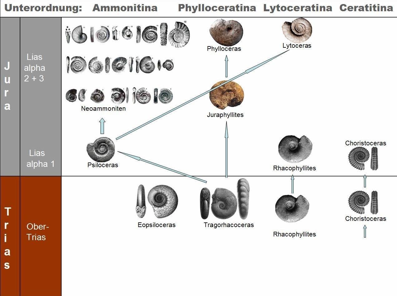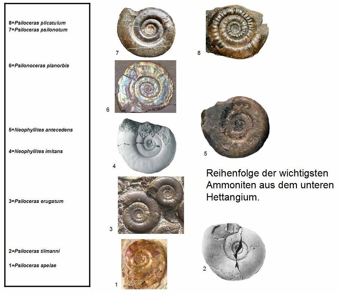 Im unteren bis mittleren Hettangium ergibt sich derzeit weltweit in etwa oben dargestellte Ammoniten- Reihenfolge. Heute tendiert es dahin, dass sich die Psiloceraten sowie die Phylloceraten aus Tragorhacoceras entwickelt haben. Eopsiloceras käme demnach nicht als Vorläufer der Psiloceraten in Betracht. Die Lytoceraten haben sich erst im untersten Jura aus den Psiloceraten entwickelt und haben keine Vorgänger in der Triaszeit. Der in der Trias häufige Rhacophyllites hat zwar noch den Schritt in den untersten Jura geschafft, findet aber dort sein Ende. Choristoceras als Spätform der Ceratiten erlischt gleichfalls im untersten Jura endgültig.