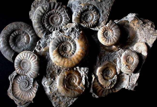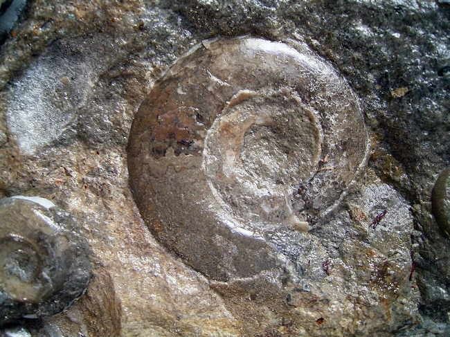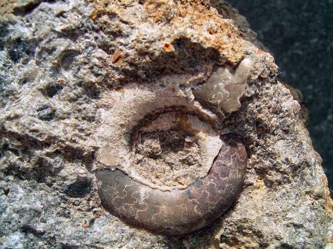 Ein Gesteinsbrocken aus dem Neophylliten-Lager. Ammoniten sind darin recht spärlich gesät und dienen wohl eher der wissenschaftlichen Forschung als der Bereicherung privater Sammlungen.