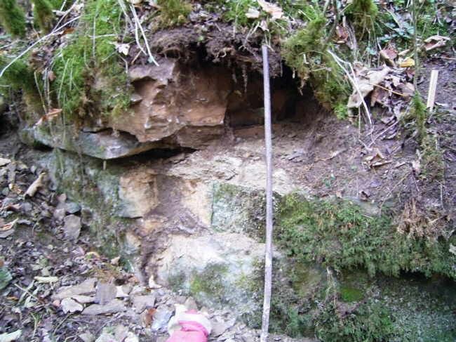 Hier ist ein Aufschluss aus der Westalb zu sehen. Genau in Bildmitte verläuft die T/J-Grenze. Es liegt das Neophylliten-Lager des untersten Juras auf dem obersten Rhät-Sandstein auf. Dazwischen verläuft ein Bonebed unterschiedlicher Stärke. Es misst 5 cm oder weniger. Es muss nochmals erwähnt werden, dass in der Westalb das erste Drittel des Hettangiums nicht zur Ablagerung kam, und daher die Horizonte des Psiloceras tilmanni, Psiloceras spleae und Psiloceras erugatum fehlen.